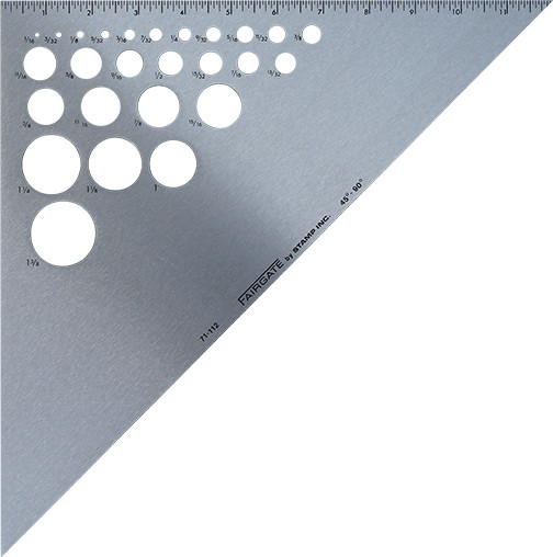 This 12" alloy circle template features a 45 degree and 90 degree angle as well and 26 different circles from a smallest of 1/16" to the largest of 1 3/8". This item will enable you to make the perfect cut every time.